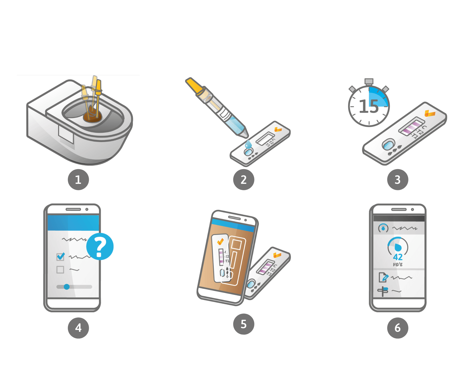 The Preventis SmarTest® FIT Home test system consists of a rapid immunological test and a smartphone app. The rapid test detects human blood in stool using gold-conjugated anti-hemoglobin antibodies, and the app quantitatively evaluates the result of the rapid test based on the color intensity of the control and test bands. The result is automatically displayed and saved on the smartphone.