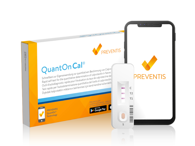 The QuantOn Cal® testing system consists of a rapid test that quantitatively detects calprotectin in stool and a smartphone app that evaluates the result of the rapid test. The result is automatically transmitted to the supervising healthcare professional.
